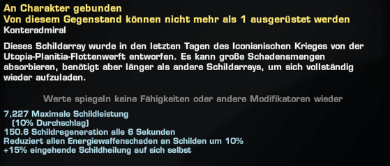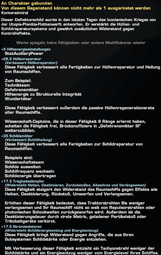 | [Eff] [H->S] [SCap] [SSR] +10% Widerstand gegen Subsystemenergieentzug +66% Energieübertragungsrate Max. Warpfaktor 10 +17.5 Warpkerneffizienz (Verbessert Energielevel wenn niedrig) Fügt 7,5% der Hilfsenergie als Bonuskraft zur Schildenergie hinzu Schildkondensator Schildenergiebuff +287,4 Schildregeneration +15 Einstellung der Schildenergie für 10 Sek. Repariert deaktivierte Schilde | 8.500 | 10.000 |