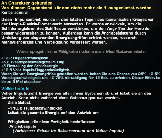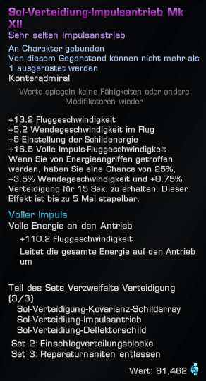 | [E->A] [ECap] [Eff] [EWS] [SSS] +10% Widerstand gegen Systemenergieentzug +66% Energieübertragungsrate Maximaler Warpfaktor 10 +17.5 Warpkerneffizienz (Verbessert Energielevel wenn niedrig) Fügt 7,5% der Antriebsenergie als Bonuskraft zur Hilfsnergie hinzu 1%ige Chance, bei erlittenem Energiewaffentreffer +10 Waffenenergie zu erhalten +0.2 Slipstream-Geschwindigkeitsbonus Antriebskondensator Antriebsenergiebuff +15 Einstellung der Antriebsenergie für 10 Sek. Repariert deaktivierte Antriebe | 12.750 | 14.000 |