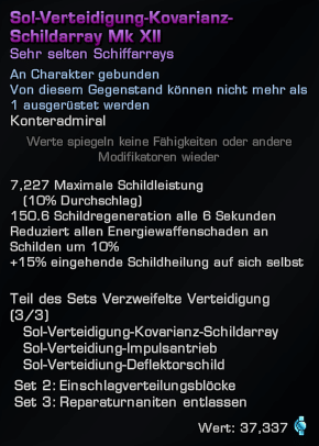 | [AMP] [Eff] [H->S] [SCap] [SSR] +10% Widerstand gegen Subsystemenergieentzug +66% Energieübertragungsrate Maximaler Warpfaktor 10 +17.5 Warpkerneffizienz (Verbessert Energielevel wenn niedrig) Fügt 7,5% der Hilfsenergie als Bonuskraft zur Schildenergie hinzu +3,3% Schaden bei Subsystemen mit 75 oder mehr Energie Während Sie sich im Sektorenraum aufhalten, ermöglicht Ihnen Ihr Slipstream-Kondensator den Slipstream-Antrieb häufiger zu benutzen. Schildkondensator Schildenergiebuff +271 Schildregneration +15 Einstellung der Schildenergie für 10 Sek. Repariert deaktivierte Schilde | 12.750 | 14.000 |